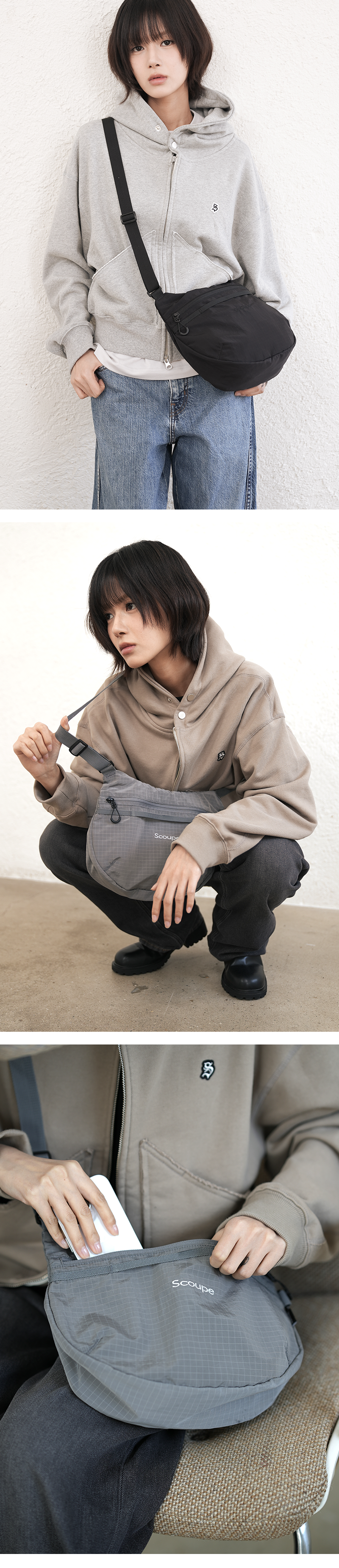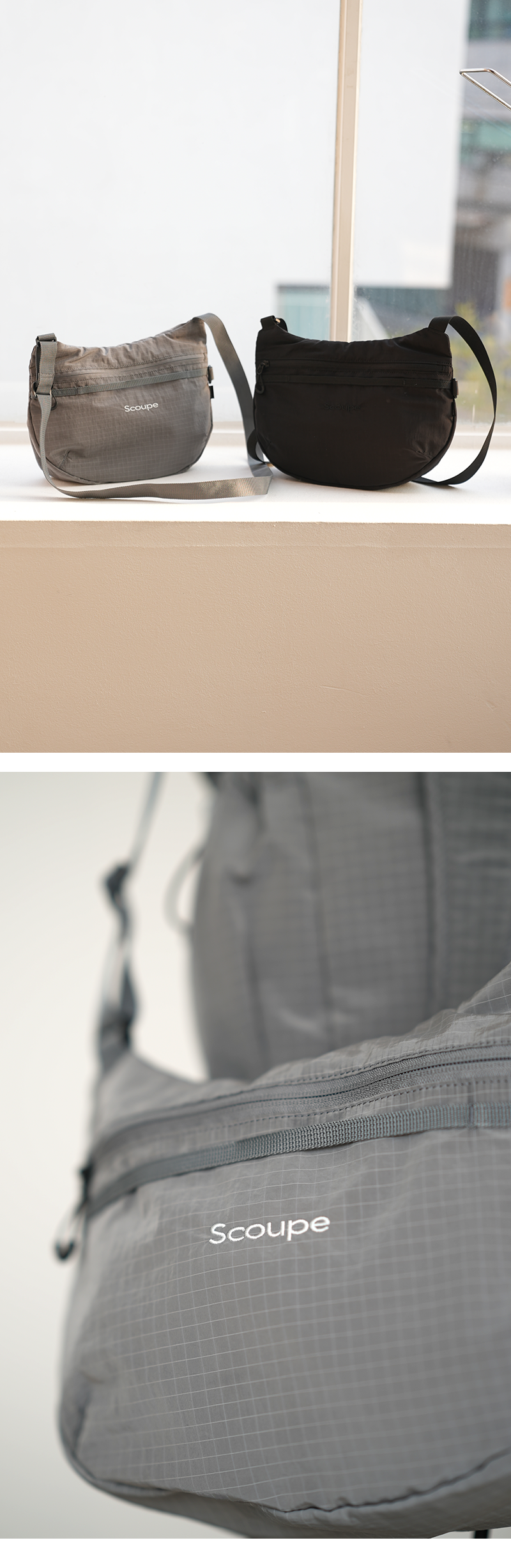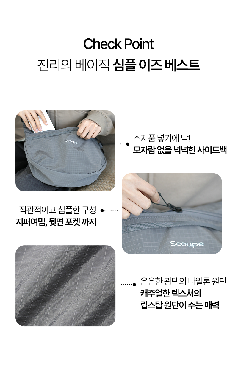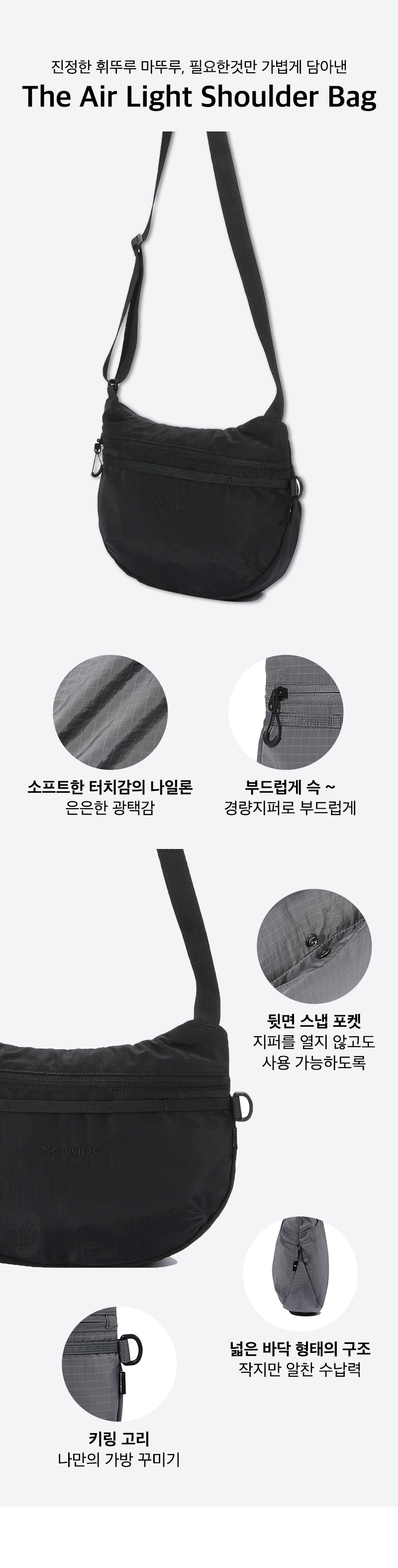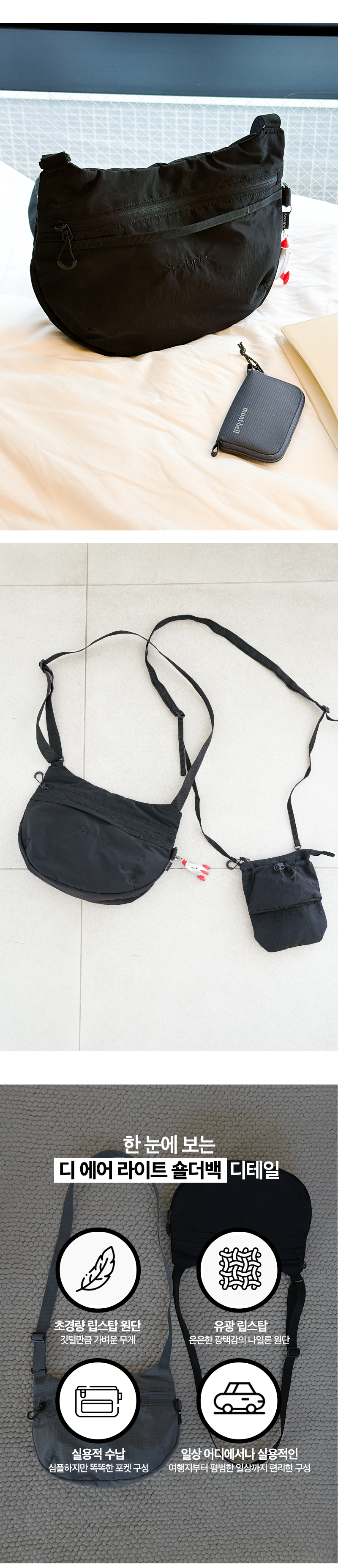 일상 어디에서나 편리하고 가볍게 사용할 수 있는 초경량 립스탑 원단을 사용한 데일리 숄더백입니다.